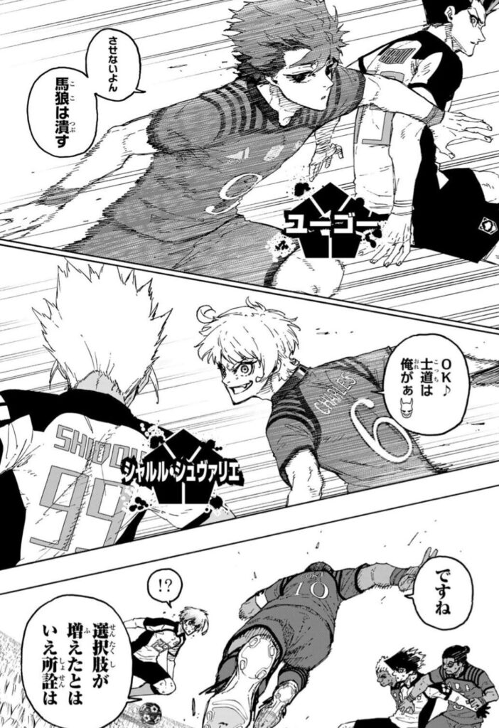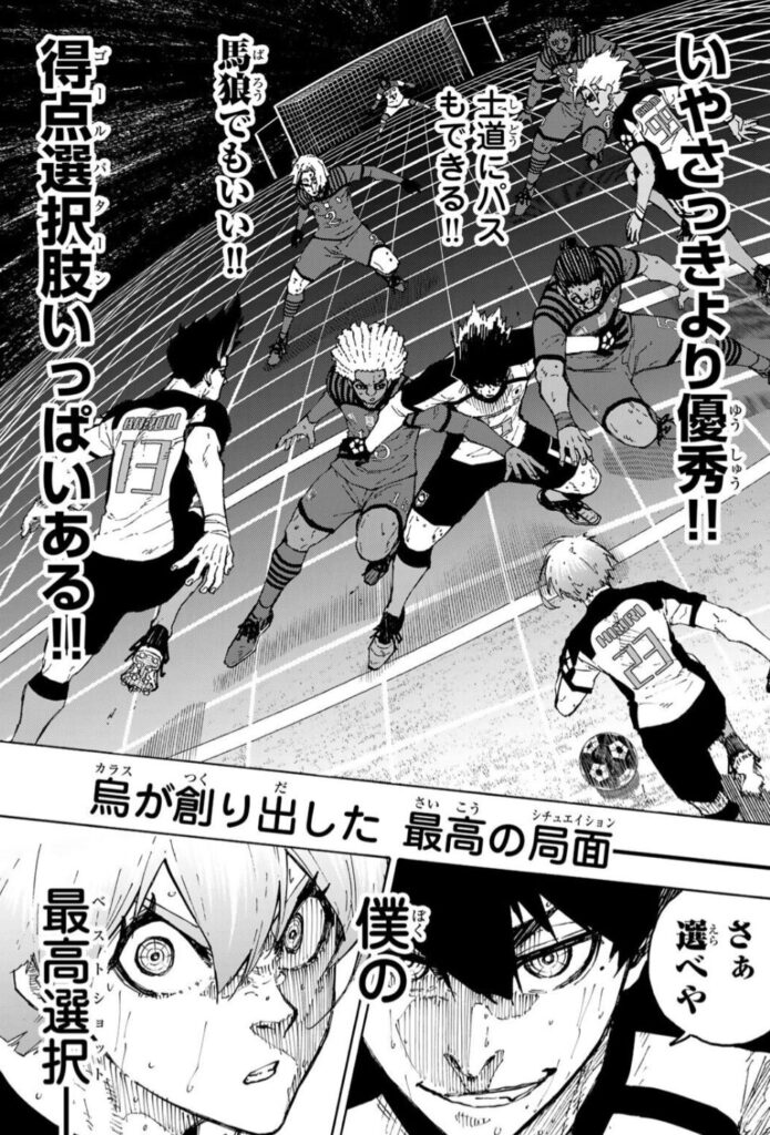 『潔 世一』はこの試合で未だになにも貢献できておらず、明らかに足を引っ張っていたが、なにかを決心し、『烏 旅人』のシステムに「繋ぎ役」として参加!