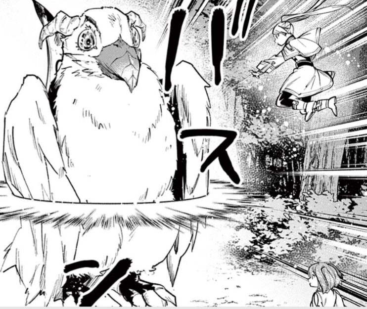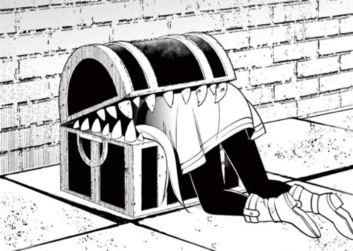 《 6巻48話「零落の王墓」》にて、宝箱の形をしている魔物『ミミック』にあっさり食べられる『フリーレン』